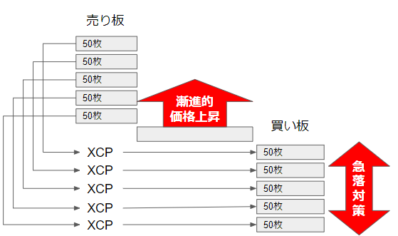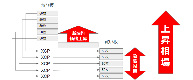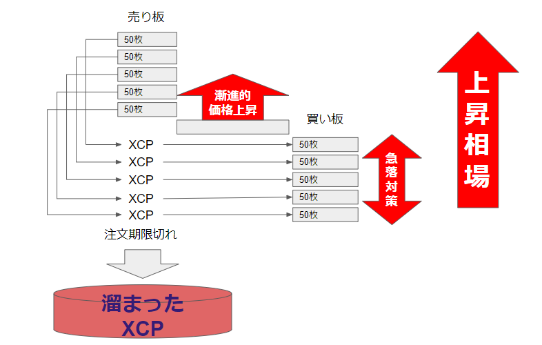 上昇相場だと買い板は置いて行かれてしまうので、XCPは自然と溜まっていきます。