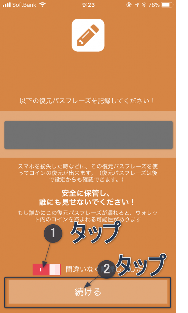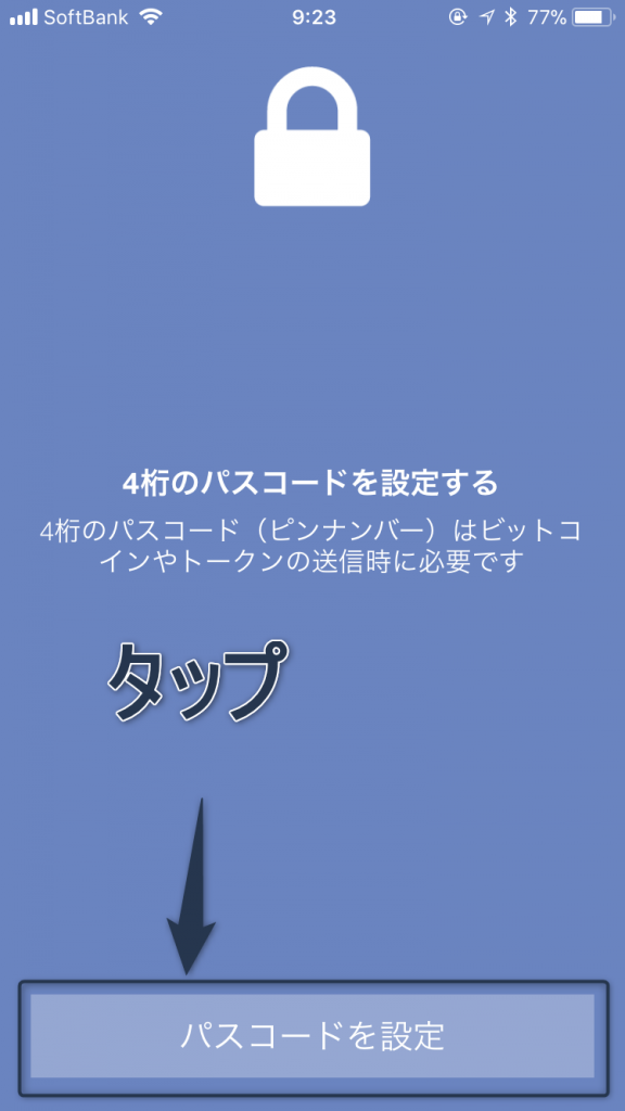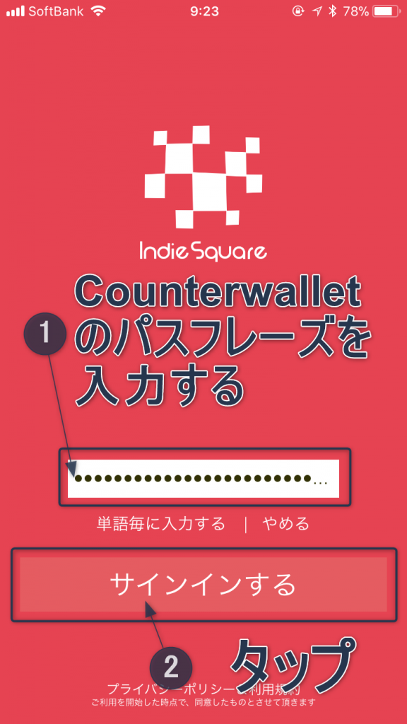 Counterwalletのログイン時に使うパスフレーズを入力します。