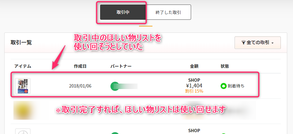 取引の状態が「到着待ち」まで進んでいれば、ほしい物リストは削除しても問題ありませんでした。
