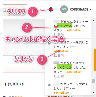 オファーが何故キャンセルされたのかについては、画面右上の通知ボタンをクリックすることで見ることができます。
