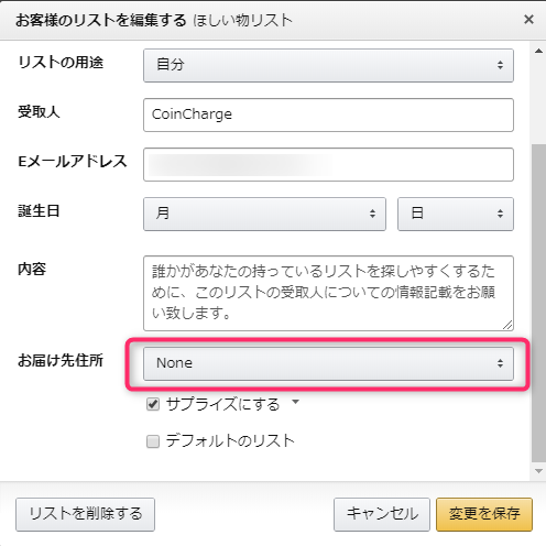 住所を選択して保存したのにNoneになる!という方は新しくもう一度欲しいものリストを新規で作成してみましょう。しっかりと選択した住所で保存されるはずです。